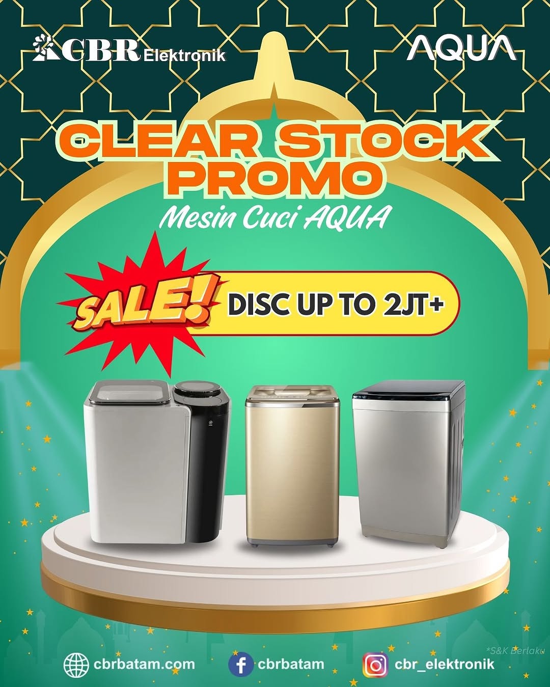 BTM.CO.ID, BATAM – CBR Elektronik Batam menghadirkan promo menarik bertajuk “Clear Stock Promo” dengan penawaran diskon besar-besaran hingga Rp2 juta untuk pembelian mesin cuci merek AQUA.