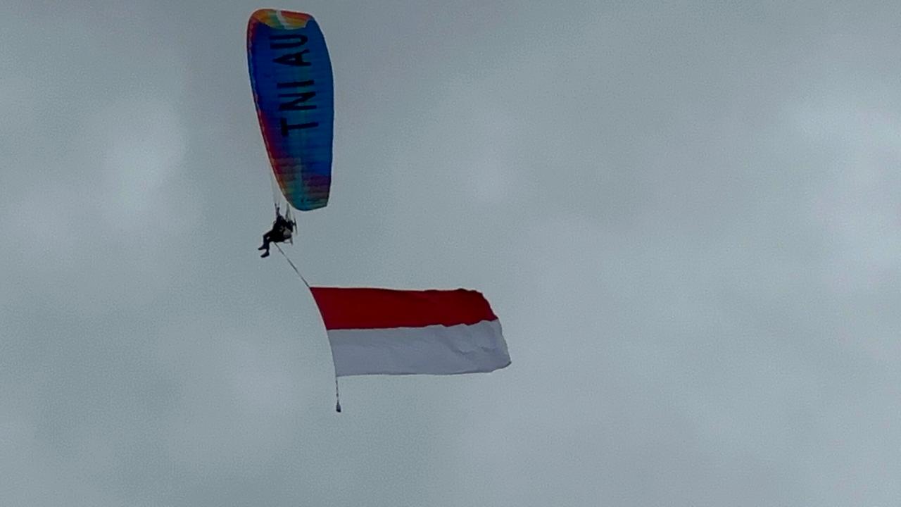 Berbeda dengan sebelumnya, Selasa (16/12/2025), kali ini atraksi diawali dengan penampilan lima paramotor dari TNI Angkatan Udara. Setiap personel membawa panji-panji. Paling depan berupa ucapan selamat HJB Ke-196, disusul bendera HJB Ke-196, TNI AU, dan Merah Putih.