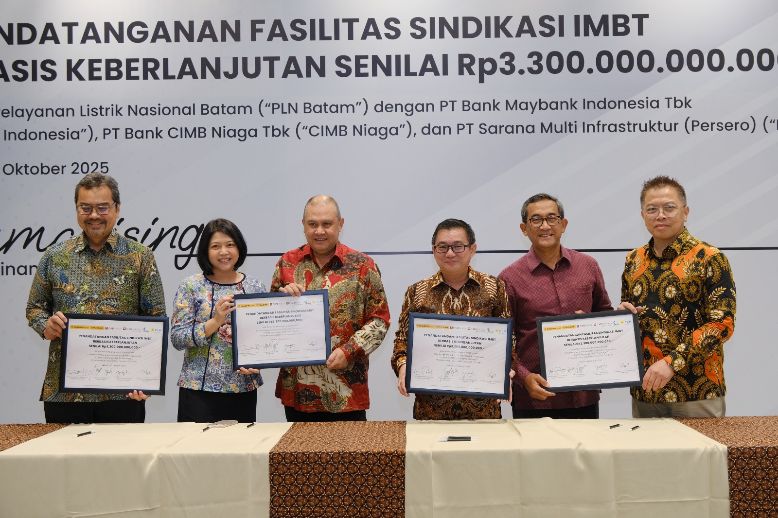 BTM.CO.ID, JAKARTA – PT PLN Batam resmi menandatangani Perjanjian Fasilitas Sindikasi Pembiayaan berdasarkan prinsip Ijarah Muntahiyah Bittamlik (IMBT) bersama PT Bank Maybank Indonesia Tbk, PT Bank CIMB Niaga Tbk, dan PT Sarana Multi Infrastruktur (Persero).