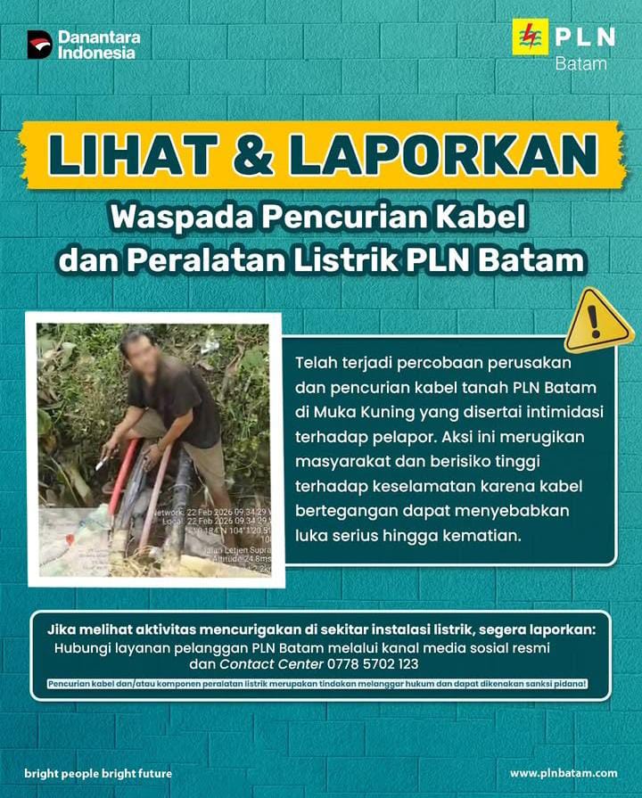 Melalui unggahan resmi di media sosial, PLN Batam mengingatkan warga untuk segera melaporkan jika menemukan aktivitas mencurigakan di sekitar instalasi listrik.